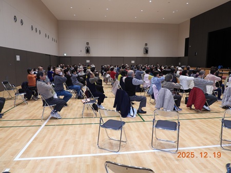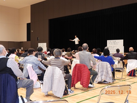 6年度フレイル予防教室を12月9日(月)中村区役所講堂にて女性リーダー会中心で受講生83名参加により実施しました。講師の指導により音楽に合わせて肩、背中をほぐし、ふくらはぎなどの筋肉を鍛え、口の体操、骨盤底筋の体操を実践しました。参加者の皆さん、講師の話に笑い、楽しく体操に取り組んでいました。今後の生活に生かしていただければと思います。