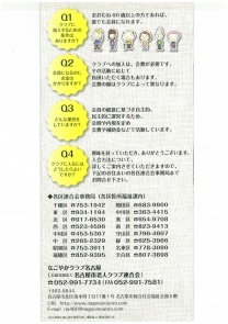 2016.08.08 なごやかクラブ名古屋 新パンフレットを作成 「なごやかクラブ名古屋」の新パンフレットを作成しました クラブを広く皆様に知っていただき、仲間づくりにつなげるために 新パンフレットを作成しました。クラブがどのような活動をしているかなど わかりやすく説明してあります。クラブの入会勧誘などにお使いください。 配布を希望される方は、市老連(052-991-7734)までご連絡ください。 表紙 裏面 入会申込書